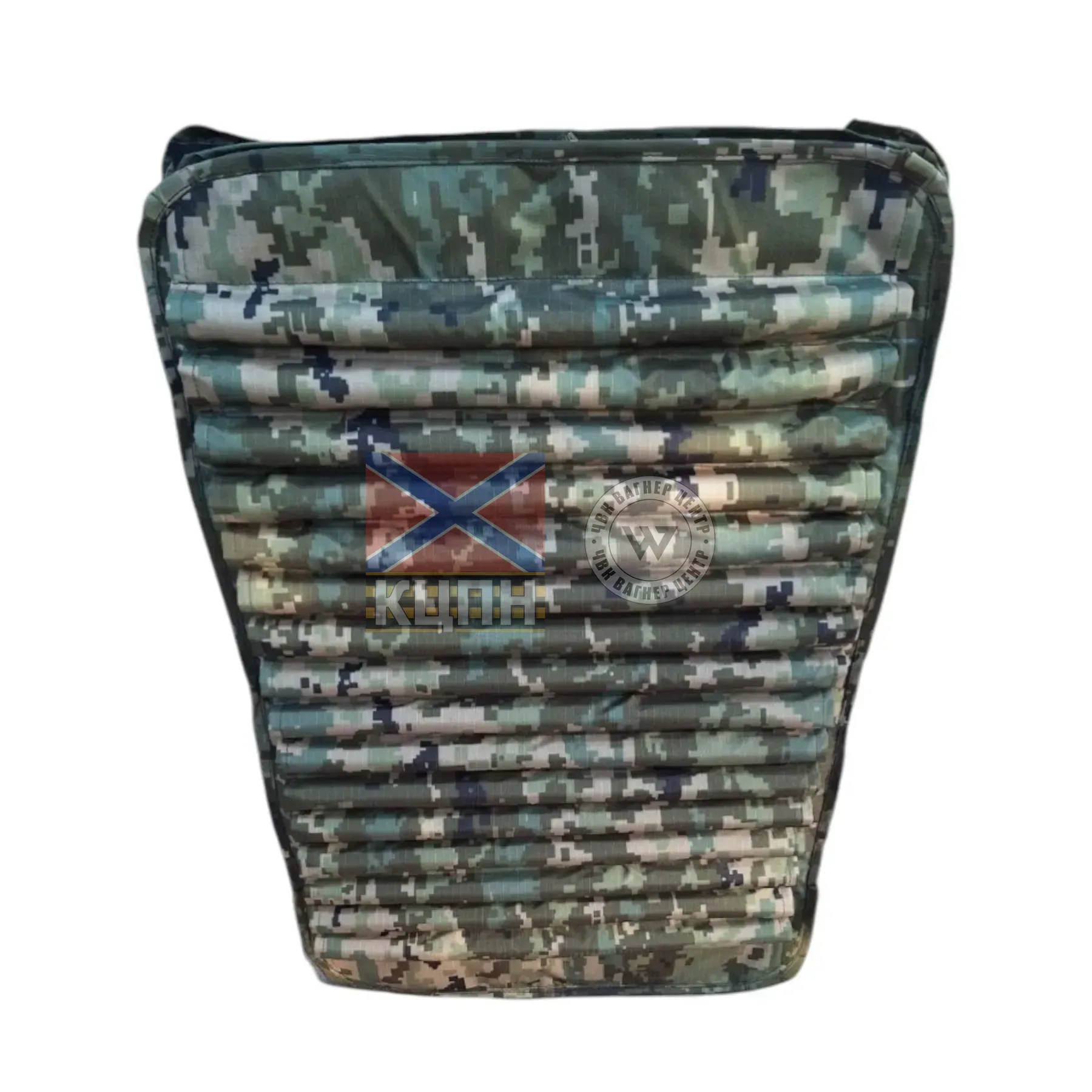 панель і закріпити його з тильної сторони за допомогою мотузки і фіксатора, таким чином, щоб тканинна ребриста трубчатої поверхні чохла була розташована на зовнішній стороні, а пухирчаста поверхня чохла була притиснута до панелі. У разі розміщення панелі на рухомих об’єктах військової техніки чохол необхідно додатково закріпити по колу стропом з фіксаторами (фастекс), щоб уникнути його втрати під час швидкого руху техніки.