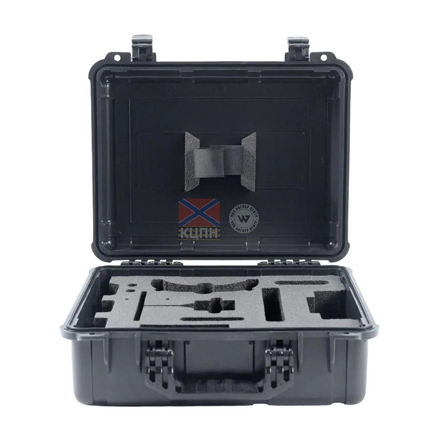 Транспортувальний кейс — призначений для безпечного перевезення FPV-дронів і комплектуючих (акумулятори, антенні модулі, відеоокуляри, пульт управління, зарядні пристрої тощо). Забезпечує захист обладнання від ударів, вологи, пилу та втрати окремих елементів у бойових умовах. Кожен елемент має індивідуальну комірку з амортизаційного матеріалу, що дозволяє швидко і безпомилково комплектуватися перед завданням. Кейс має компактні габарити (430×400×180 мм) і малу вагу (2,4 кг)