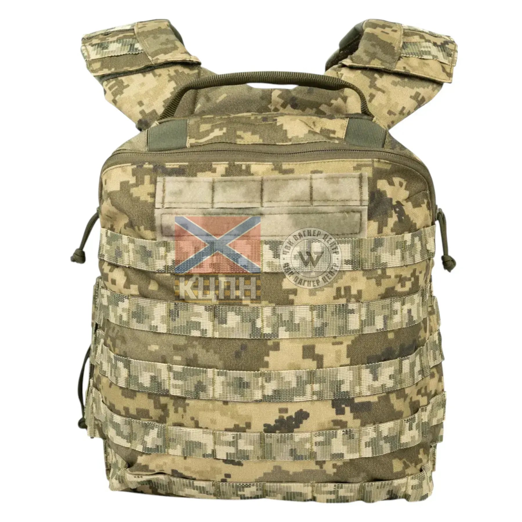 Це дає змогу кріпити додаткове спорядження відповідно до поточних потреб та завдань бійця. Система екстреного скидання. Її ключовим елементом є сталевий трос, після висмикування якого конструкція розпадається на частини. Ручки приводу розміщені на рівні грудей та сховані на внутрішню сторону, де їх легко намацати. Вони виконані у формі хлястиків та додатково фіксуються кнопками, що унеможливлює випадкове зачеплення. Швидке скидання. Забезпечується безшумними пряжками на камербандах, які тут встановлені замість липучок. Розкриття на лівий або правий бік відбувається після легкого, короткого руху однією рукою. Внутрішні демпферні подушки і 3D-сітка. Ними вкрита вся внутрішня поверхня плитоноски. А це сприяє активній циркуляції повітря та ефективному зменшенню заперешкодної деформації. Технічні характеристики Вага чохла: 1240 г. Матеріал: нейлон (Cordura 1000D), 3D-сітка, гіполон. Стропа: поліамід нейлон. Липучка: Velcro® Alfatex. Фурнітура: 2M (Італія), Ammolit Plus (Україна). Особливості: зі швидким скидом; без плит. Розмір: регульований (по талії 60-120 см). Під бронеплити: L-XL 27×33 см.