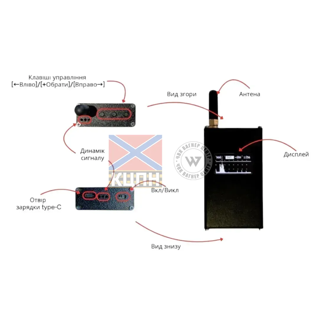 - Режим «Тривога» для контролю: режим моніторингу, щоб контролювати роботу вашого РЕБ у реальному часі. Прилад подасть гучний звуковий сигнал «ТРИВОГА!!!», якщо сигнал від вашого засобу РЕБ зникне через розрядку батареї, перегрів або пошкодження.