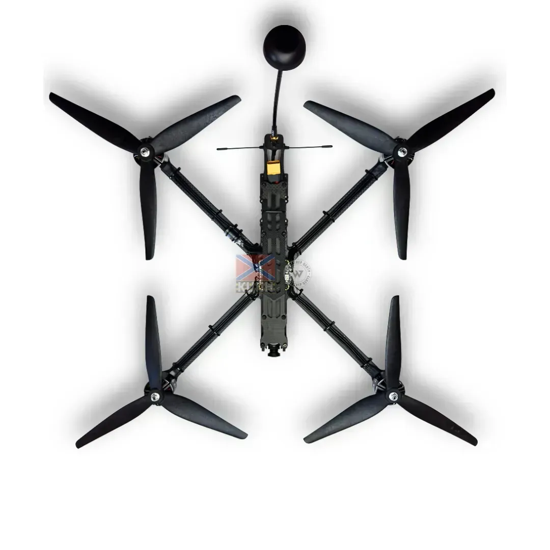Корпус дрона виготовлений із надміцного карбону, стійкого до механічних навантажень. Завдяки оптимальній аеродинаміці та підібраній електроніці забезпечується стабільний політ, висока маневреність і точне наведення на ціль.