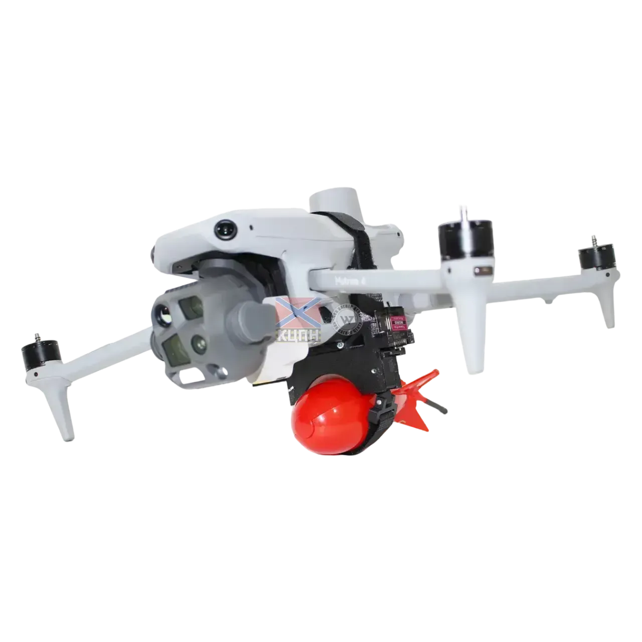 Автономна система для транспортування та скидання різнопланового корисного навантаження на DJI MATRICE 4T. Система є автономним навісним обладнанням на дрон, має автономне живлення та працює шляхом зчитування світлових сигналів дрона за допомогою фото елемента. Завдяки такій конструкції, система для своєї роботи не потребує втручання в архітектуру дрона. Застосування системи не потребує! при експлуатації дрона вимикання нижніх датчиків положення.