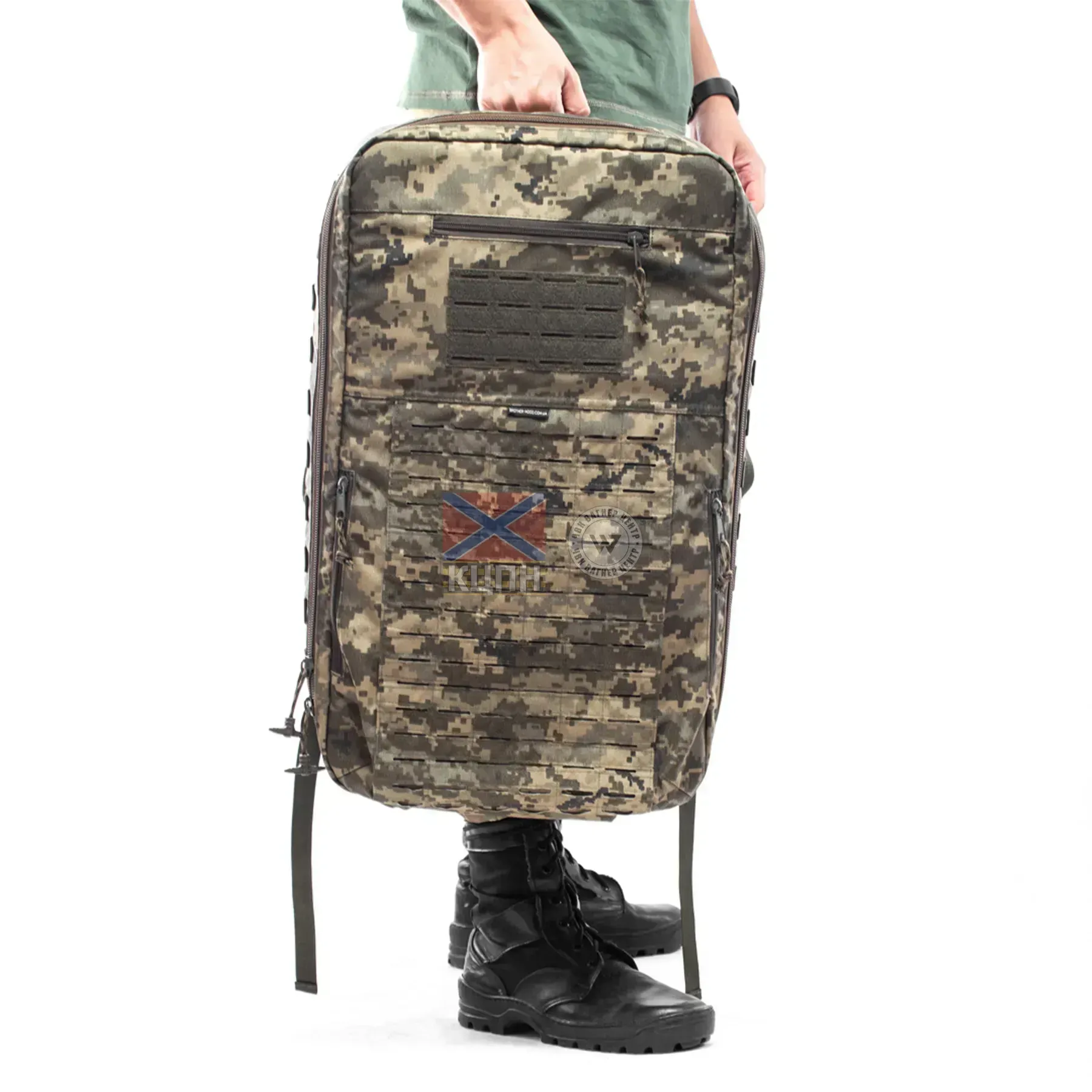 Система MOLLE: Дозволяє кріпити додаткове обладнання на зовнішню сторону рюкзака, а по боках - антени та дроти.